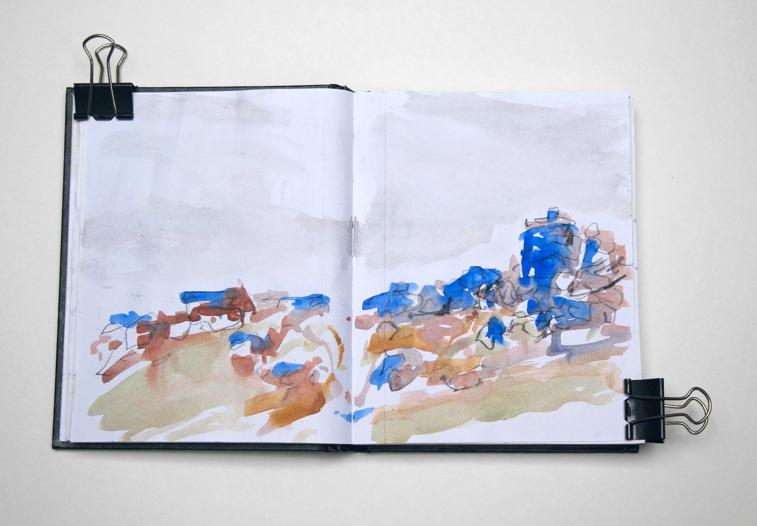 The following pages are taken from my sketchbooks and mostly plein-air studies. I prefer to work outdoors and work across multiple sketchbooks at a time as it allows me to work quickly and respond directly to the landscape in front of me. The pages range from the Peak District, Scottish Highlands and the North East Coastline.